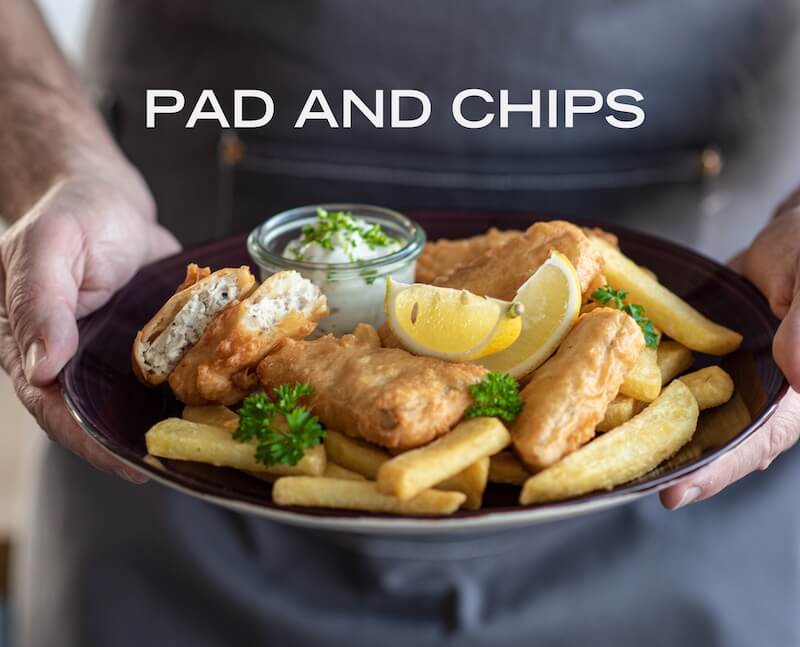 Um das beliebte englische Fingerfood mit dem Fungi Pad zu kreieren, müsst Ihr das Pad einfach durch einen einfachen Backteig aus Ei, Mehl, Backpulver, Milch, Salz und Pfeffer ziehen und das Ganze in einer Pfanne ausbacken. Dazu ein paar Pommes im Backofen zubereiten und diese zusammen mit dem ausgebackenen Pad und frischen Zitronen servieren.